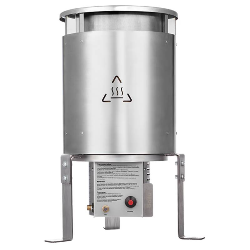 Корпус выполнен из нержавеющей стали, а запуск осуществляется с помощью пьезорозжига, поэтому подключение и начало работы не требуют лишних действий. Верхняя крышка защищает горелку от прямых осадков, снижает риск выброса открытого пламени и дополнительно участвует в теплоотдаче. При необходимости ее можно использовать как конфорку для нагрева воды или строительных смесей.