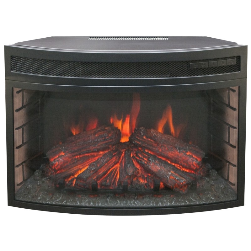 Электрический очаг для встраивания в обрамления под широкий очаг 25'. Полукруглое (панорамное) фронтальное стекло. Пятиступенчатая регулировка яркости огня. Шесть режимов работы полуторакиловаттного инфракрасного обогревателя. Модель оснащена пультом дистанционного управления. Встроен таймер выключения электрокамина.