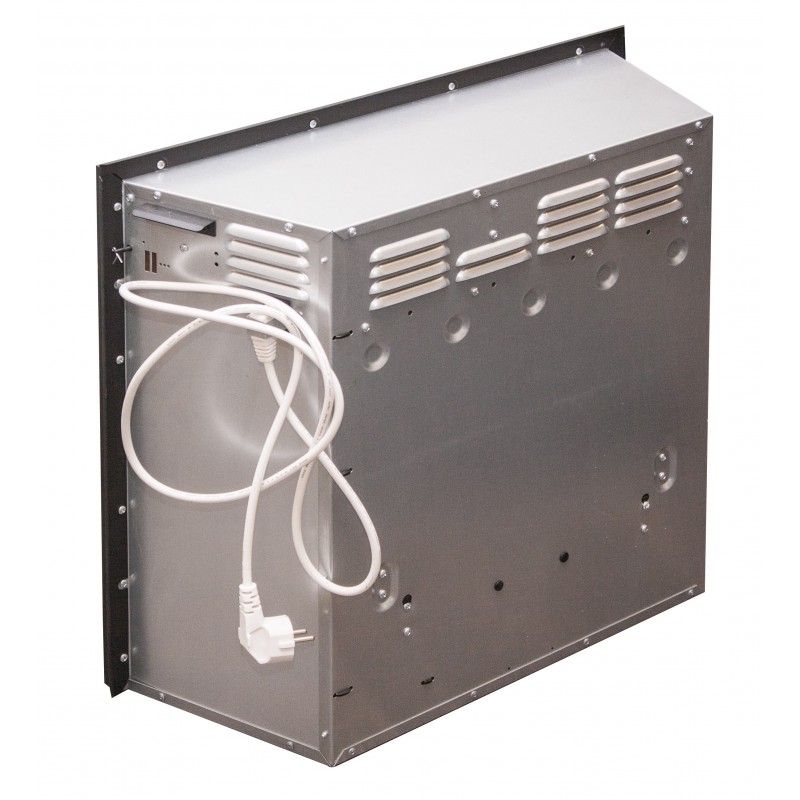 Электрический очаг предназначен для встраивания в обрамления под широкий очаг. Эффект горящей топки с многоцветным пламенем и муляжом дров за двумя дверками с металлическими шторами. Регулируемая яркость пламени и дистанционное управление. Нагреватель с поддувом спрятан в верхней части очага и обеспечивает обогрев в холодную погоду. Переключатель позволяет включать на полную или половинную мощность.