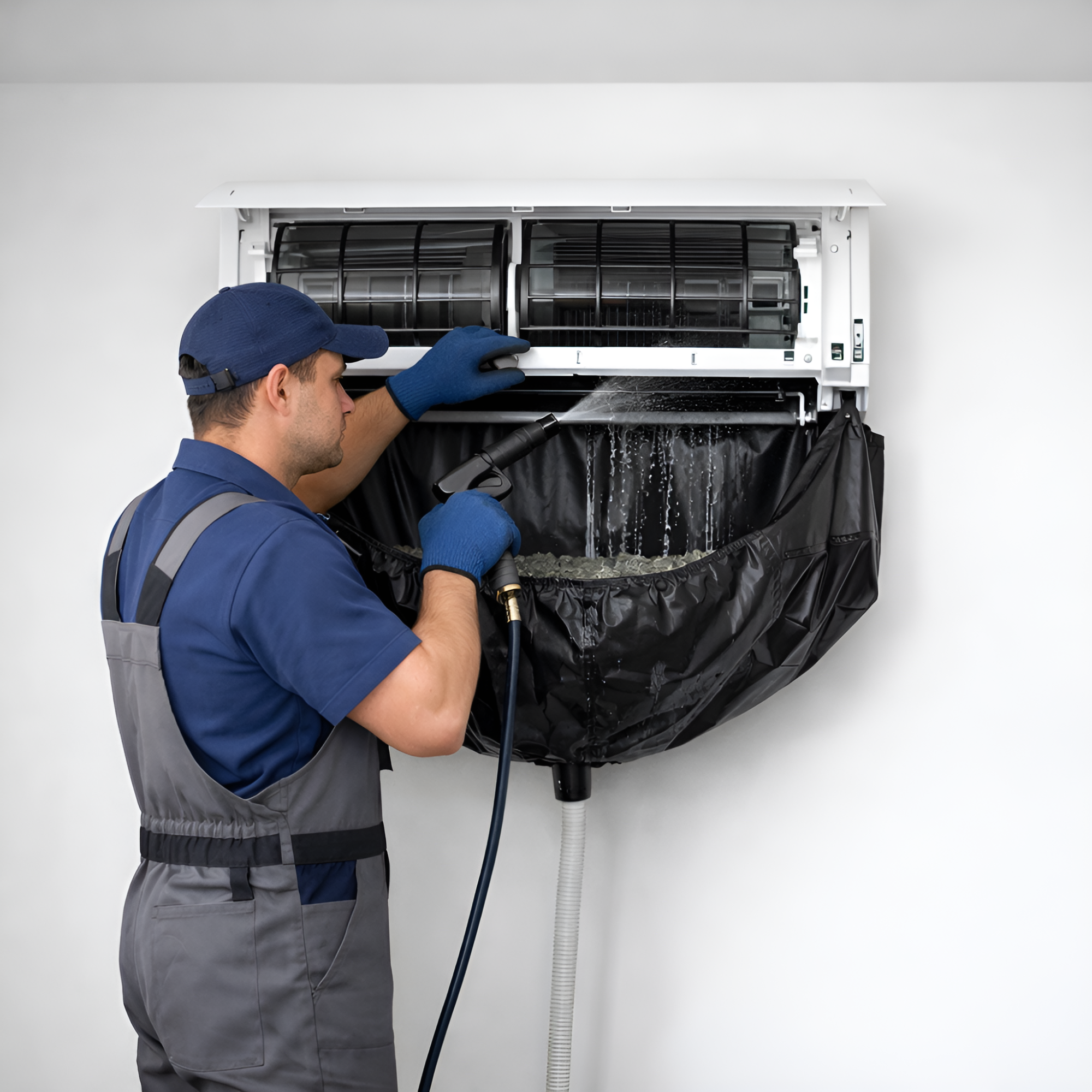 Для обслуживания используются специальное сервисное оборудование, включая мойку высокого давления для кондиционеров, сервисные чехлы и профессиональные чистящие растворы. Это позволяет провести чистку настенного кондиционера более аккуратно и эффективно, удалить загрязнения с внутренних узлов и обеспечить качественный сервис без лишнего загрязнения помещения.
