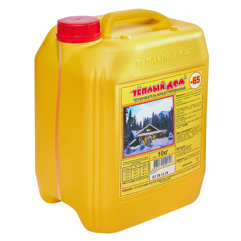 Концентрированый теплоноситель "Теплый Дом-65" производится с применением комбинированного пакета антикоррозионных, противонакипных и противопенных присадок и предназначен для получения теплоносителей отопления - водных растворов с меньшей температурой кристаллизации (замерзания). Уменьшение концентрации этиленгликоля (что снижает и температуру замерзания - начала кристаллизации) позволяет повысить теплоемкость и теплопроводность раствора, а также значительно уменьшить вязкость, тем самым улучшая циркуляцию теплоносителя в системе и существенно увеличить теплоотдачу системы. Наилучшими теплофизическими характеристиками для климатической зоны Центральной России обладают теплоносители, изготовленные на температуры начала кристаллизации на -25°С и на -30°С.