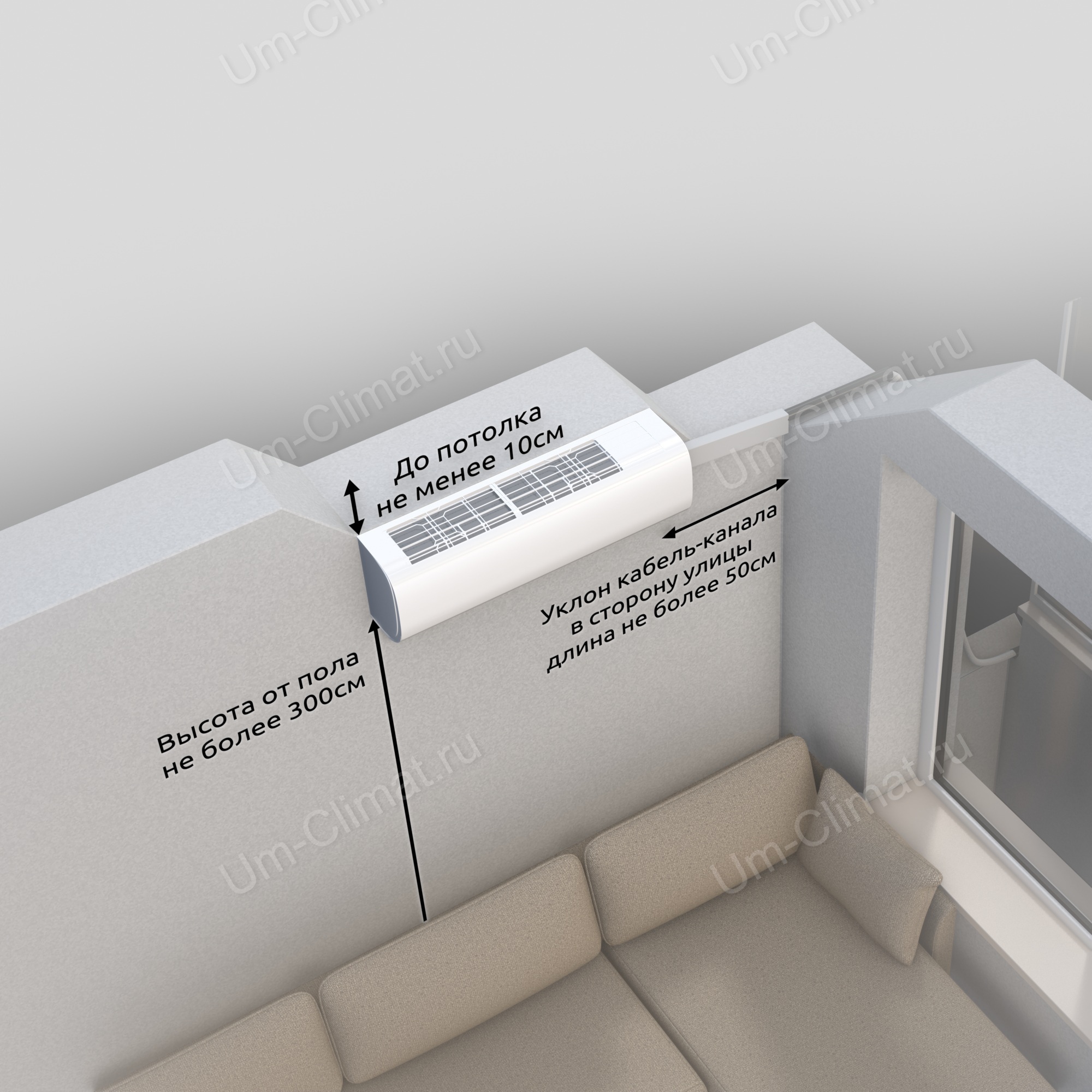 - Внутренний блок монтируется на левой стене относительно окна, отступая от угла не менее 10 см и не более 50 см.