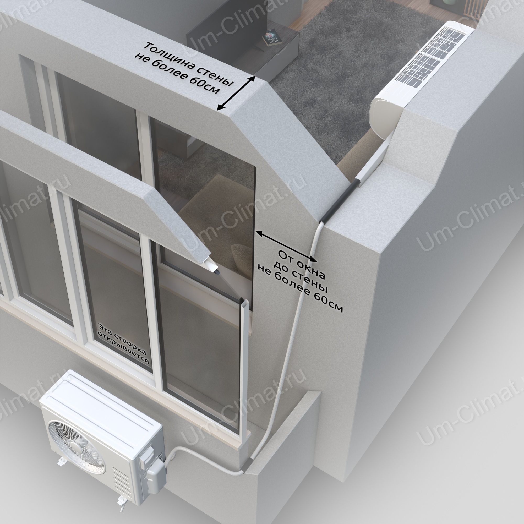 Установка внешнего блока кондиционера под окном на внешней стороне балкона (под открывающейся створкой) предусматривает: