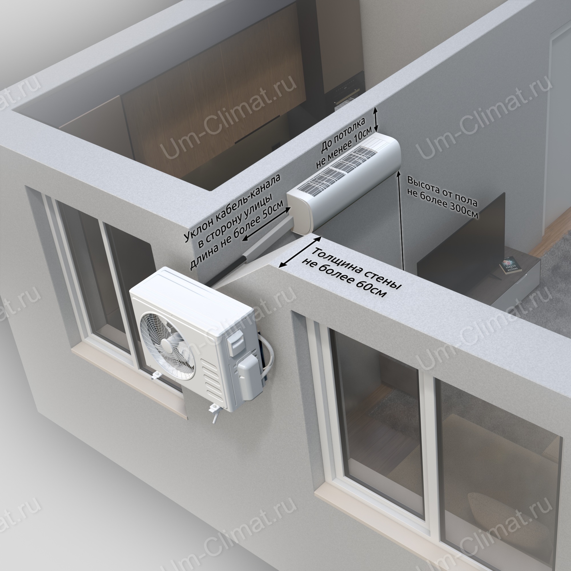 - Трасса кондиционера в помещении закрывается декоративным кабель-каналом (60×60 мм) и прокладывается под углом к улице для отвода конденсата.